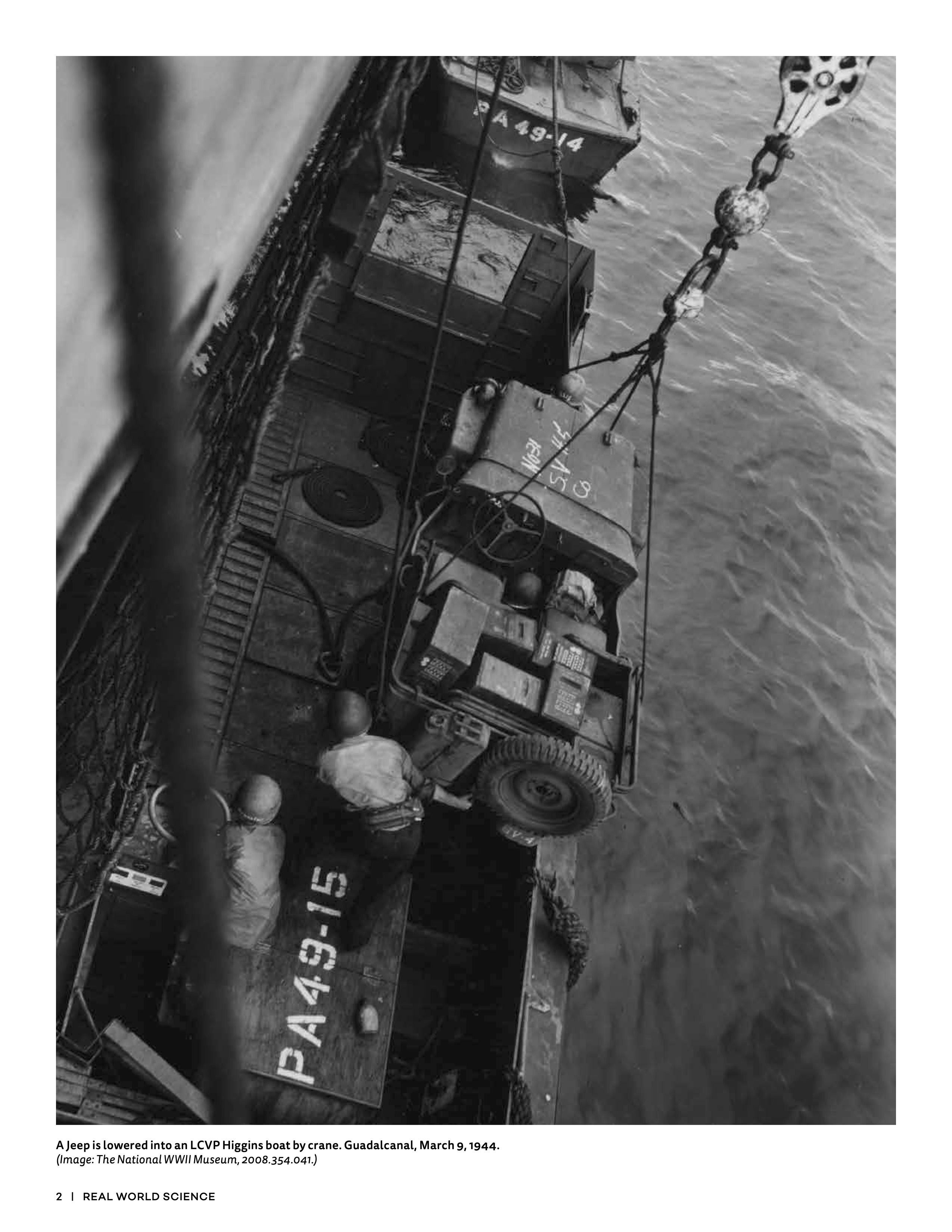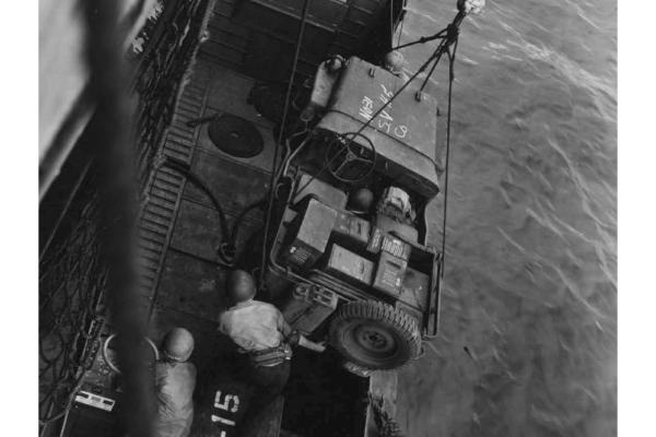 Jeep is lowered into Higgins boat. Guadalcanal, March 9, 1944